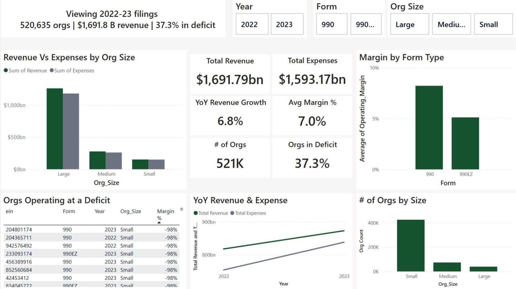 IRS bulk files list every Form 990 and 990-EZ return, but they arrive as enormous spreadsheets. Hundreds of fields, hundreds of thousands of rows, and little context. I distilled them into a one-page Power BI report that shows revenue trends, deficit risk, and outliers in seconds.